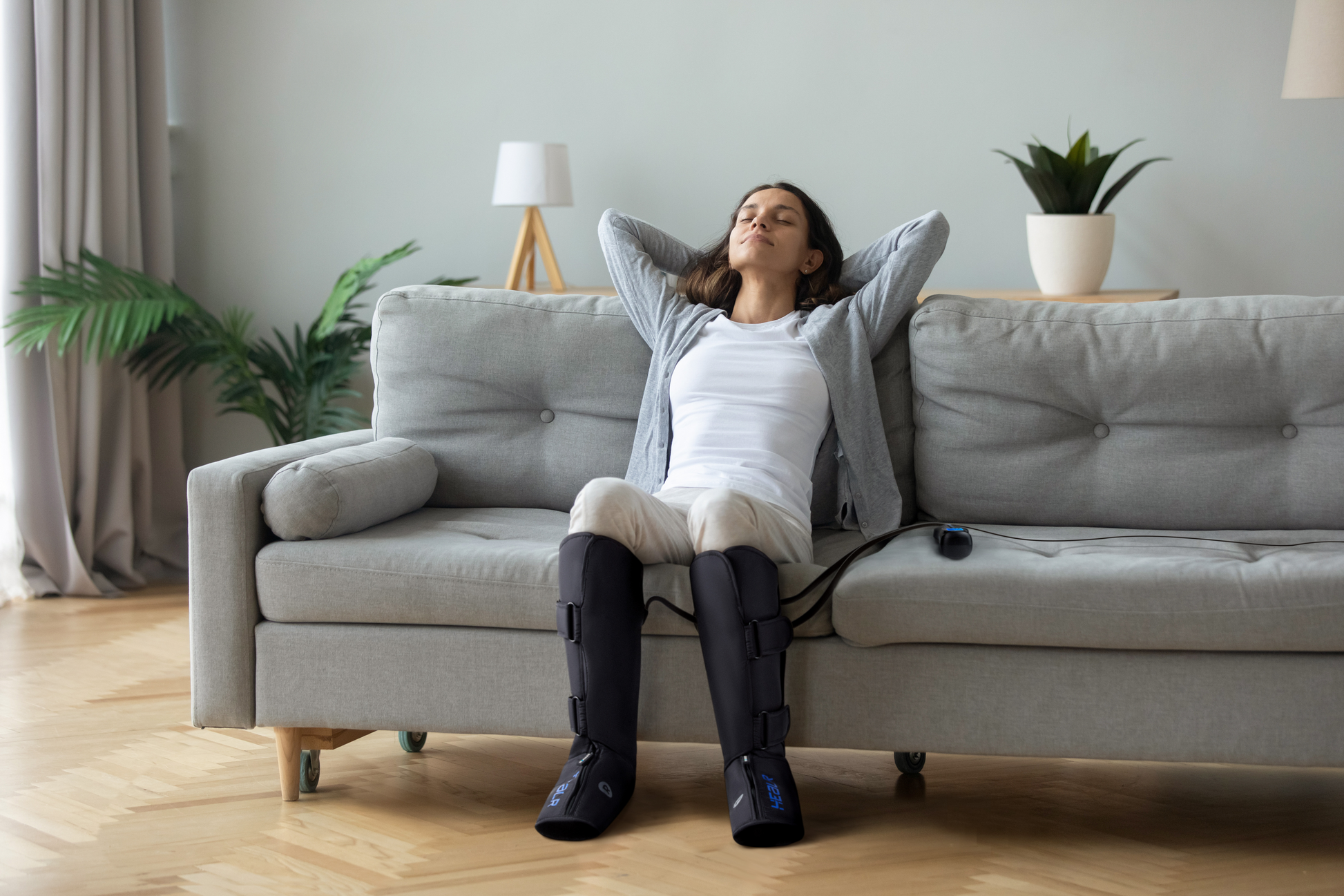 Calf and foot massagers offering triple therapeutic action: air compression, heat, and cold (special precooled pads go into the internal pockets).