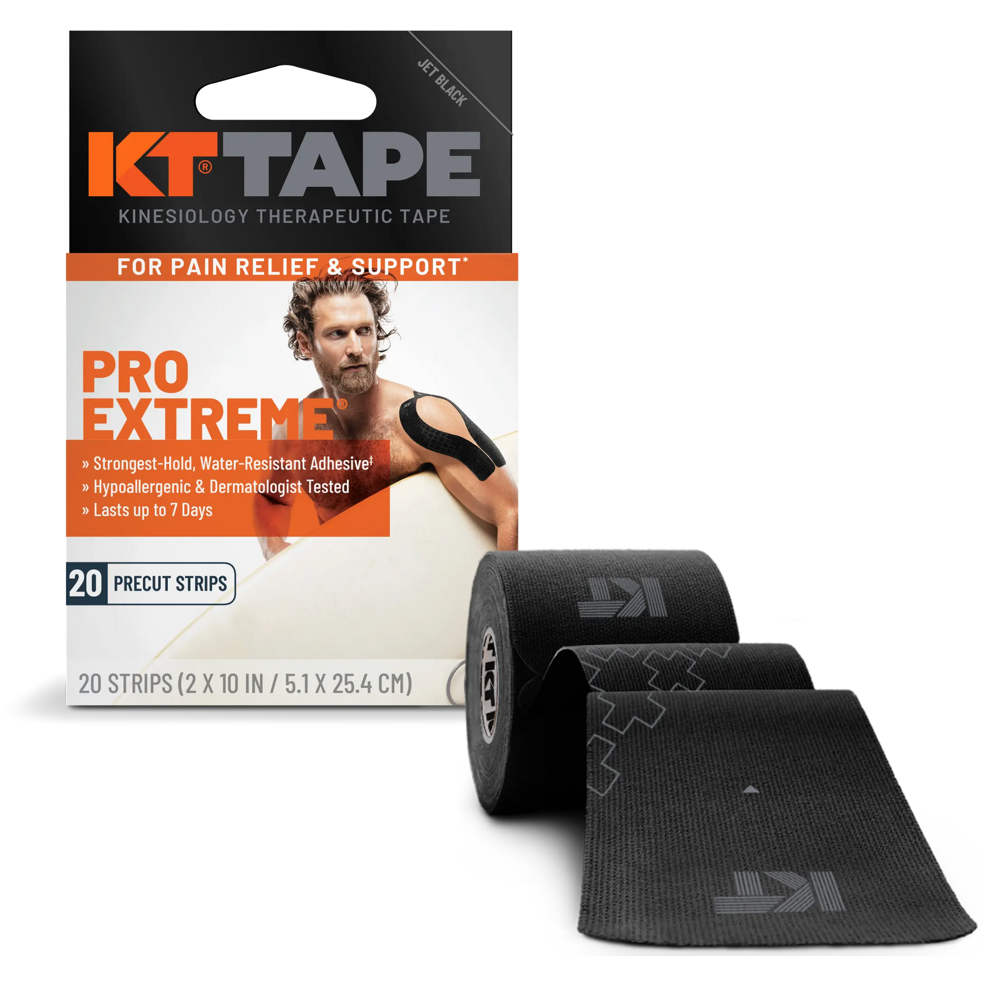 KT Tape Pro Extreme® is pre-cut and ready to apply right out of the box. Pre-cut strips have rounded corners which help to prevent the corners from catching on clothing or the edges fraying. Each roll contains 20 pre-cut strips that are 10 inches long and 2 inches wide.