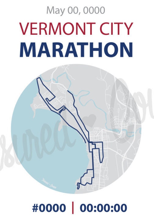 Vermont City Marathon - Digital File & Print options available, Custom Map, Race Map, GPS Map, Running Map, Course Route, Race Results